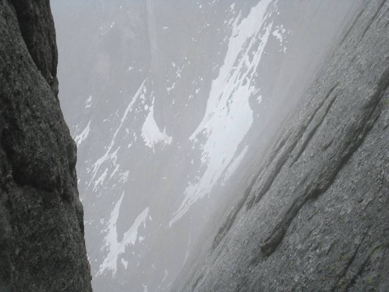 Wetterverschlechterung in den rampfigen Ausstiegskaminen der Badile-NO-Wand