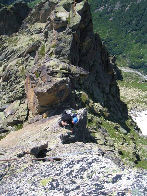 Blick zurück zu gerade überholten Seilschaften. Der unmittelbar sichtbare Gratzacken wird (im Aufstiegssinne) links umgangen