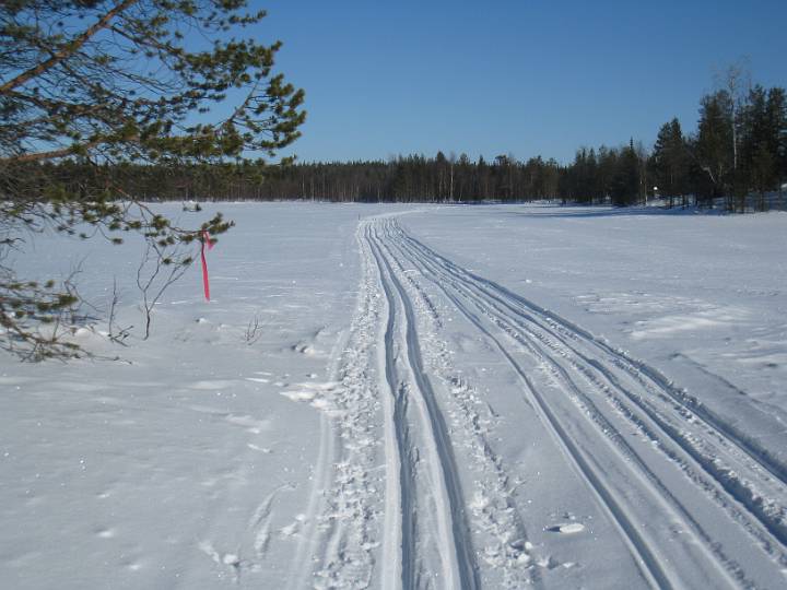 IMG 0104 | Immer den roten Bändchen nach ...Die Rajalta Rajalle führt zu etwa 25% über Loipen, zu etwa 50% querfeldein oder auf Wanderwegen mit Privatspur (wie hier) und den Rest auf gespurten Wegen und Straßen. Nur etwa 5% bewegten sich auf unangenehm festgefahrenen Straßen (in Finnland haben die Leute im Winter Spikes, so dass Streuen nicht nötig ist, dennoch muss man auf das eine oder andere Steinchen achtgeben) | ![]() |
