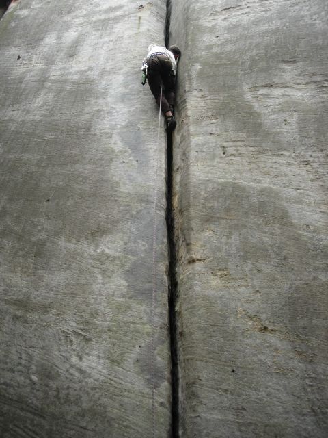 Christoph im "Übungsriss" nahe des Haupt-Pfades. Man beachte die Höhe des ersten Rings (dies ist eine Teleaufnahme!).
